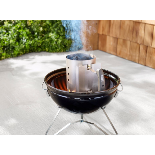 Malý zapalovací komín je neocenitelným pomocníkem také pro majitele udíren Weber Smokey Mountain Cooker. Pokud potřebujete během dlouhého uzení jen lehce „přiložit“ pár čerstvých briket pro udržení teploty, tento komín vám je připraví stranou, abyste do udírny nesypali studené a kouřící palivo, které by mohlo ovlivnit chuť masa.